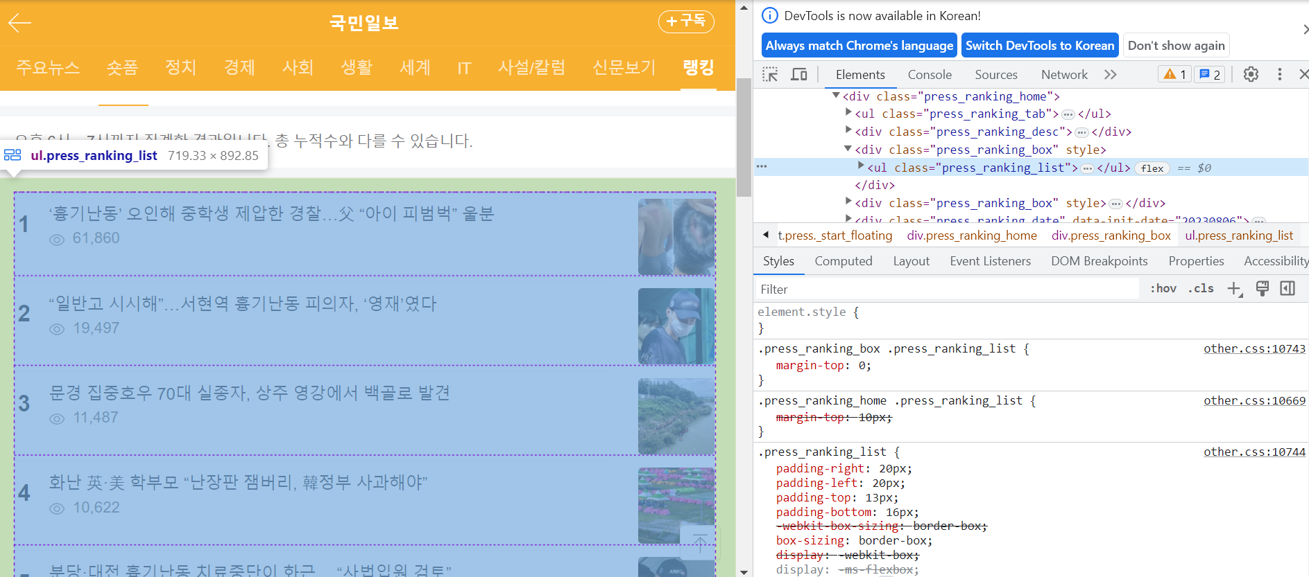 네이버 뉴스에 있는 언론사별로 랭킹뉴스 1~10위까지를 크롤링해보자.